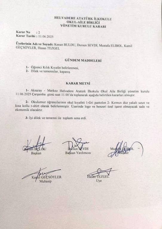 ayrıca Okul Aile Birliği Yönetim Kurulumuzun 11.06.2025 tarihinde aldığı karar neticesinde;
